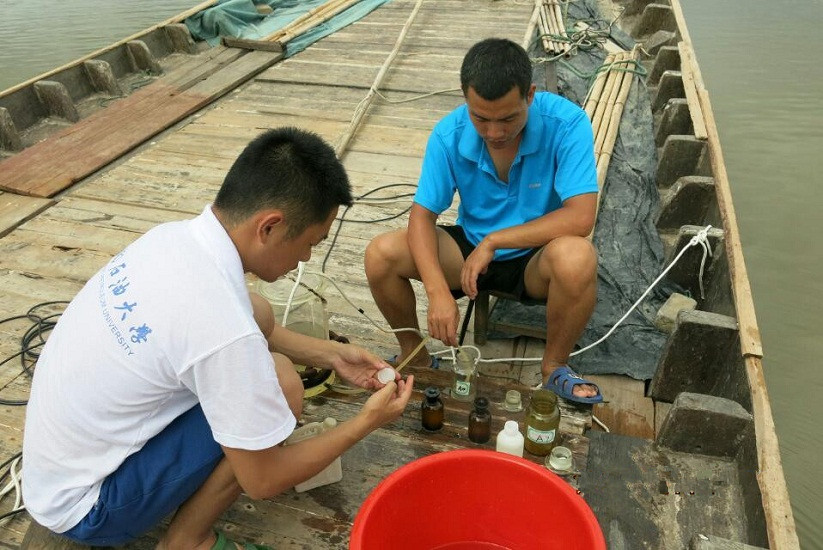 7月10日,團(tuán)隊(duì)聯(lián)合廣西海洋研究所紅樹林研究中心對(duì)欽江東西支流進(jìn)行水樣調(diào)查,這是此次活動(dòng)中的重要工作。6名男生在船上和工作人員一同工作了26個(gè)小時(shí),協(xié)助工作人員進(jìn)行水樣采集與固定,流速與流向測(cè)定,水深測(cè)定及GPS定位等,從中也學(xué)到了很多海洋知識(shí)。