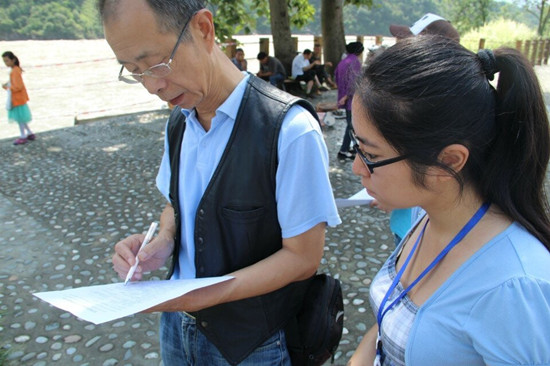 副隊長呂悅帶領的一隊隊員向游客分發(fā)調(diào)查問卷,了解他們對生態(tài)文明建設和中國夢的看法。