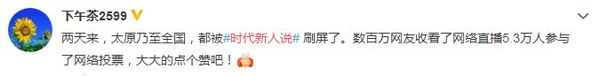 #時代新人說#微博話題下不乏這樣的留言:“太原乃至全國,都被‘時代新人說’刷屏了”、“雖不是太原人,也刷著直播頁面,被時代新人說的力量感染著”。