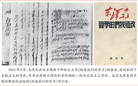 延安整風(fēng)運(yùn)動以反對主觀主義、宗派主義、黨八股,樹立馬克思主義作風(fēng)為主要內(nèi)容。而鑒于深重的思想之弊和慘痛的實(shí)踐教訓(xùn),反對主觀主義以整頓學(xué)風(fēng),成為開展整風(fēng)運(yùn)動的關(guān)鍵。整風(fēng)運(yùn)動開展后,毛澤東就緊緊抓住思想方法和作風(fēng)問題不放。他在給中央研究組同志的信中指出:學(xué)習(xí)理論要“以研究思想方法論為主”。破除錯(cuò)誤的思想方法,暢行正確的思想作風(fēng),最重要的就是要遵循實(shí)事求是的思想路線,做到理論聯(lián)系實(shí)際!皩(shí)事求是”這個(gè)詞,并非毛澤東首創(chuàng),但把“實(shí)事求是”上升到黨的思想路線的高度,則是毛澤東的功勞。毛澤東強(qiáng)調(diào),“要分清創(chuàng)造性的馬克思主義和教條式的馬克思主義”,“宣傳創(chuàng)造性的馬克思主義”,“使中國革命豐富的實(shí)際馬克思主義化”。不能從理論上來思考中國革命實(shí)踐的人,是不能妄稱為馬克思主義理論家的。只有從客觀實(shí)際中概括出而又在客觀實(shí)際中得到證明的理論,才稱得起我們所講的理論。