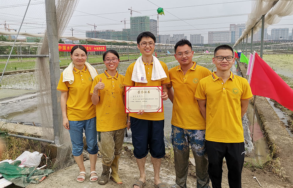 王克劍(中)帶隊(duì)參加中國(guó)水稻研究所組織的插秧比賽。受訪者供圖